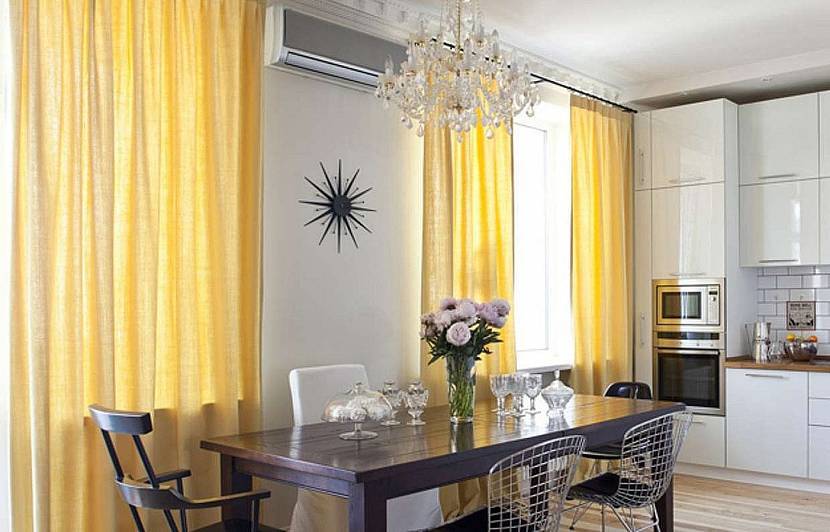 Шторы для кухни-гостиной часто оформляют в желтом цвете. Яркие, насыщенные тона (канареечный, кукурузный, шафрановый) размещают в рабочей зоне, создавая нужное настроение в помещении. Для занавесок зала уместна нежная палитра: