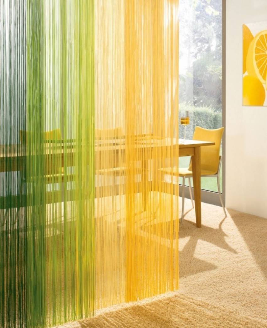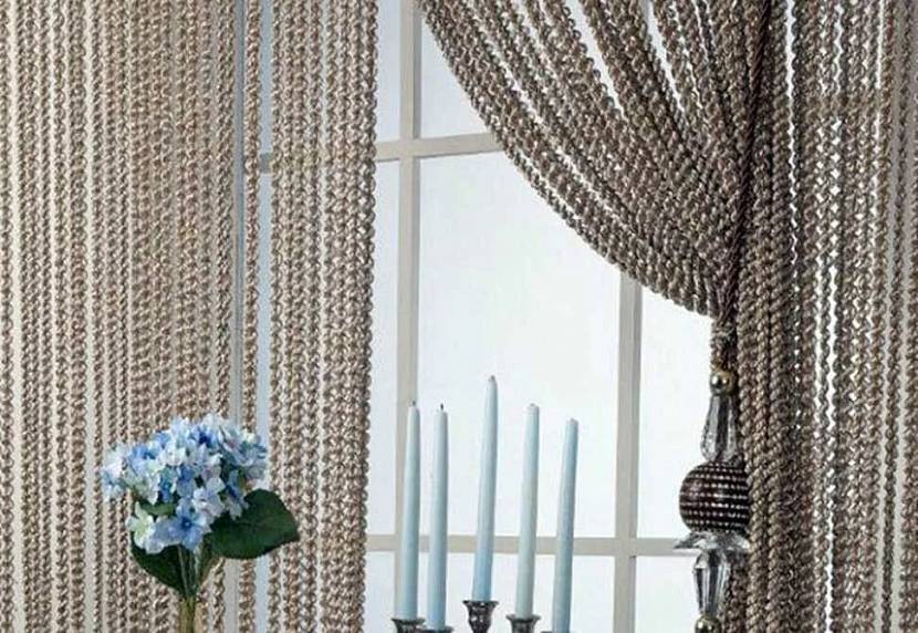 - Нитяные шторы-занавеси. Их можно купить готовые, но интереснее сделать своими руками – тогда цвет и фактура вы выберете именно те, которые хочется.