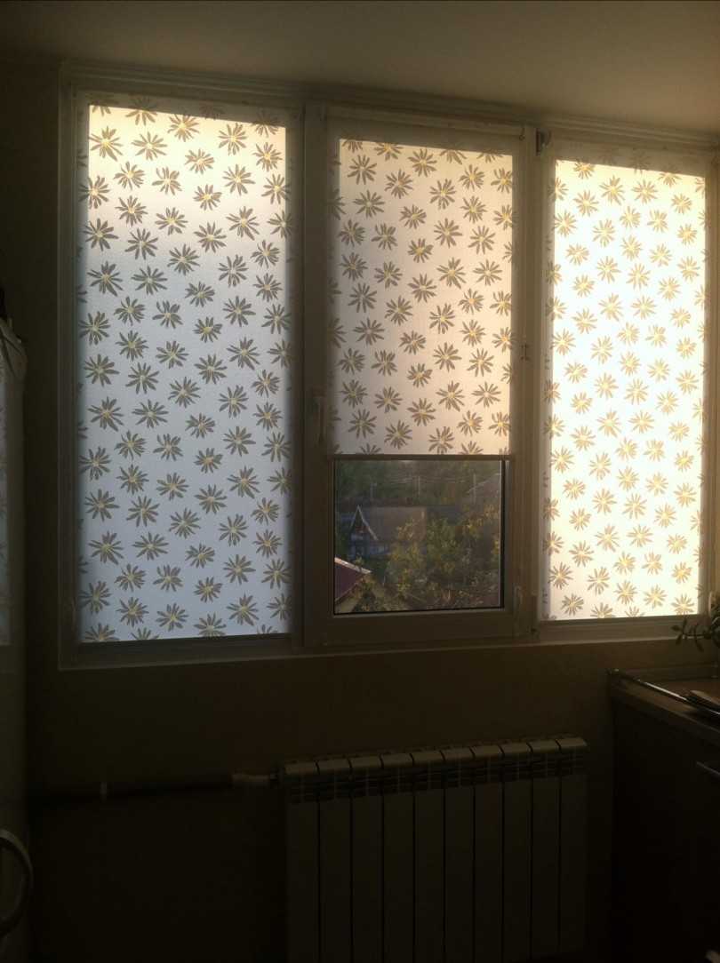 Виниловая пленка с клейким краем или цветной скотч 2 оттенков. Приклейте прямо на стекло через промежутки равные ширине полос, оставляя открытым часть стекла. Результат выглядит как симбиоз жалюзи и матового стекла, станет отличной находкой для окон, которые вы собирались сделать непрозрачными. В отличие от витражной пленки, они пропускают больше света, но маскируют не хуже.