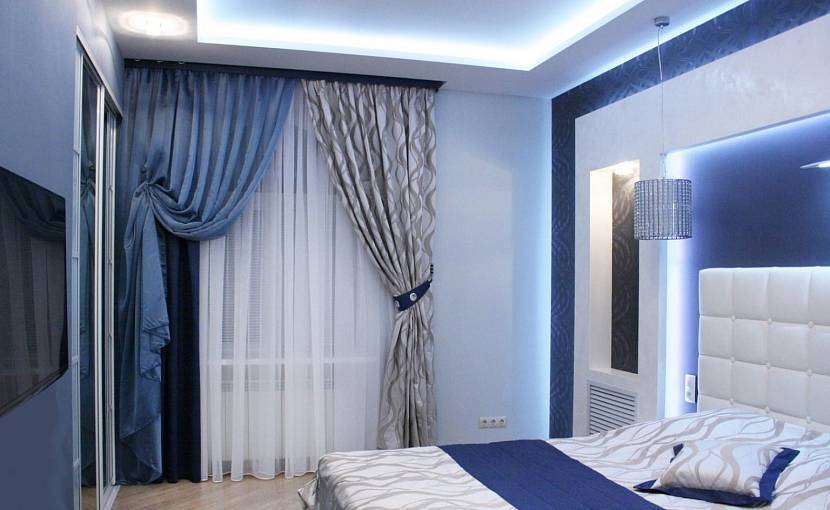 Для просторных спален с высокими потолками применяется выпуск занавесок из багетов (встроенный карниз). Тюль размещается стандартно с формированием волн одинакового размера. Для декорации вешаются двойные ночные шторы из атласного или шелкового материала. С помощью декоративных лент или шнуров одна часть ночных портьер закрепляется в пучок.
