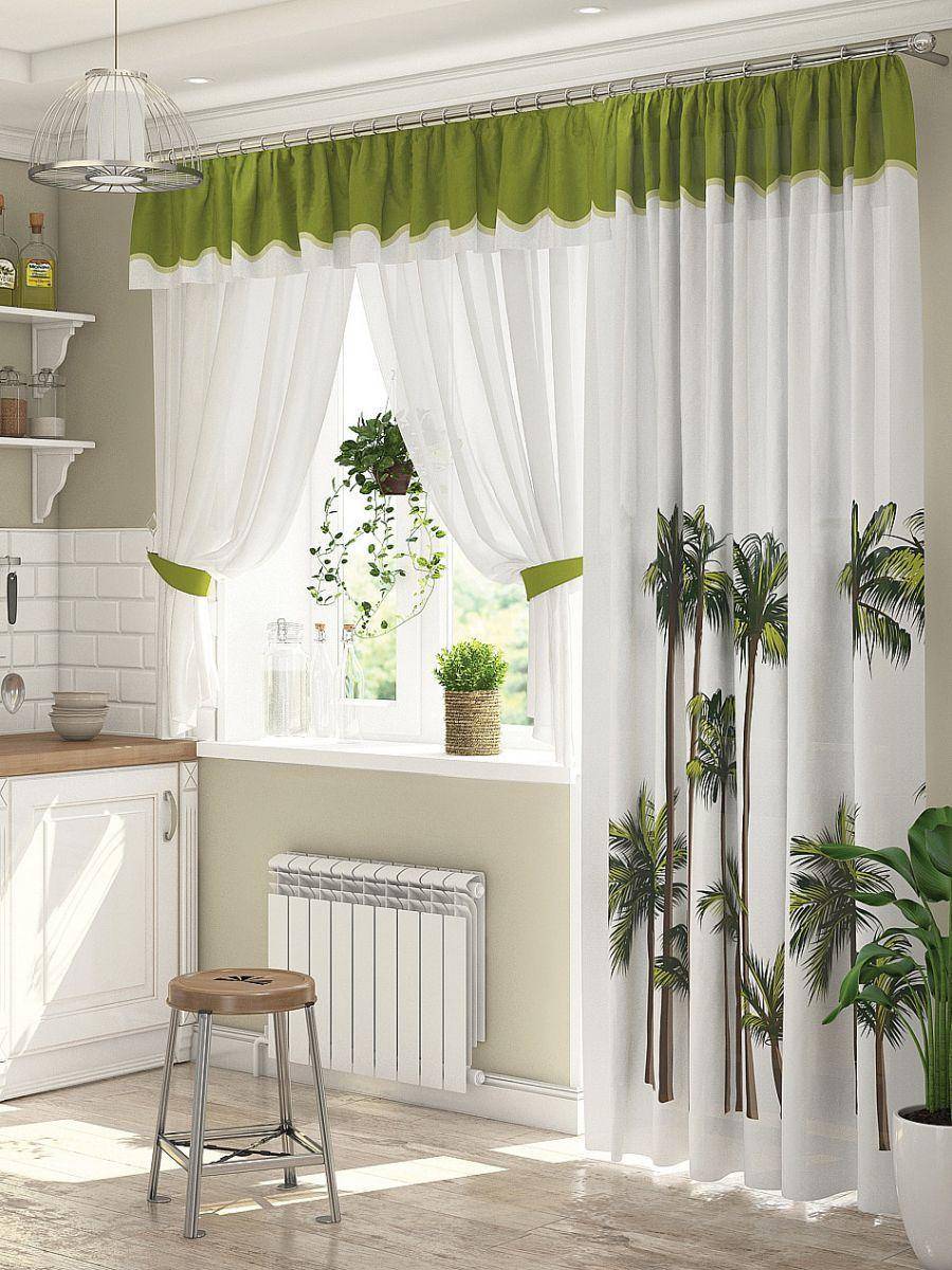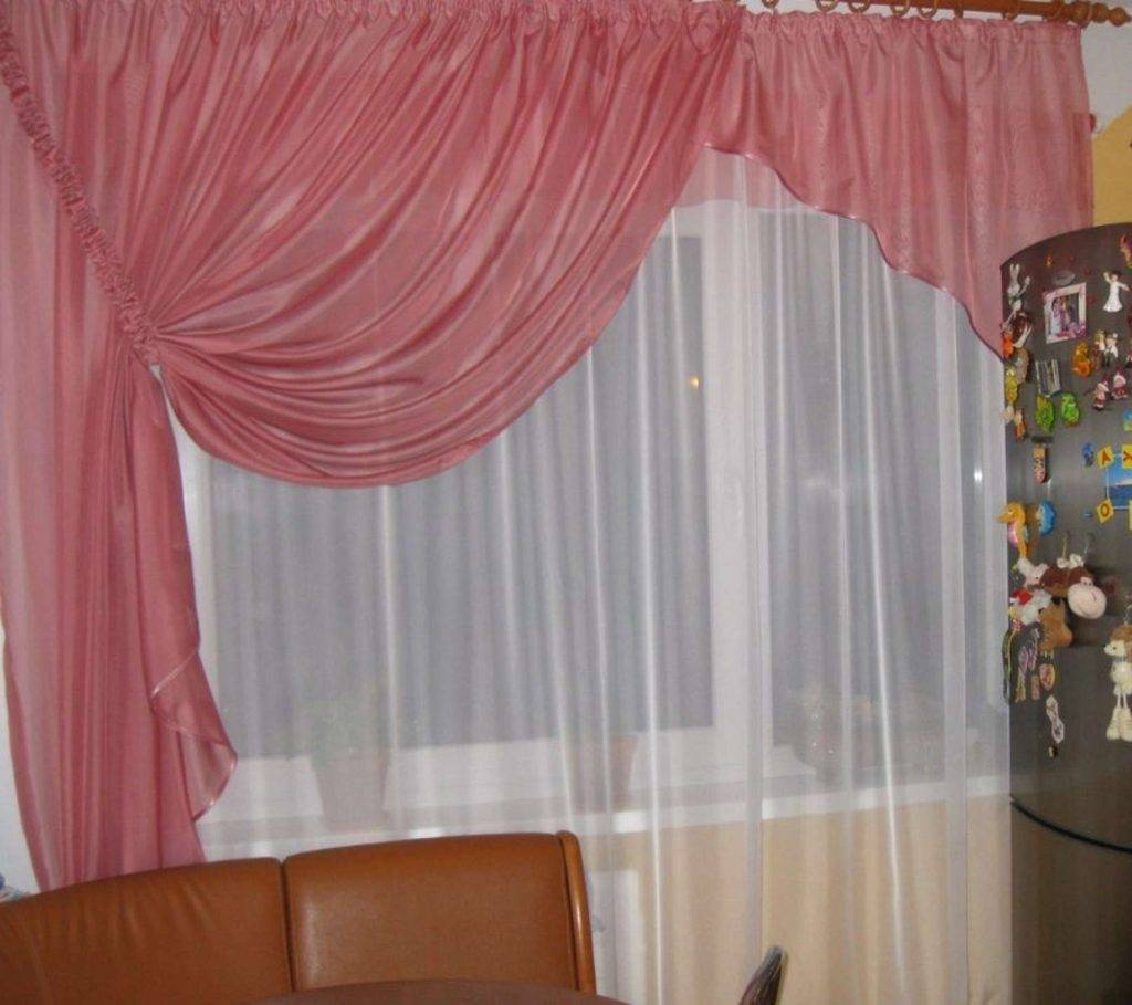 Полупрозрачный тюль гармонично выглядит с пышным асимметричным ламбрекеном. При этом следует избегать пышных драпировок и множественных складок в слишком тесных кухнях, у которых низкий потолок.