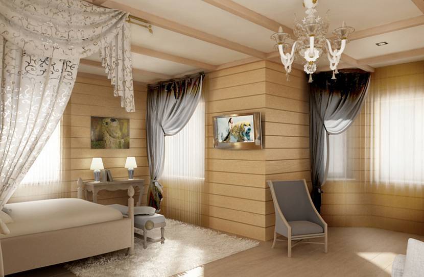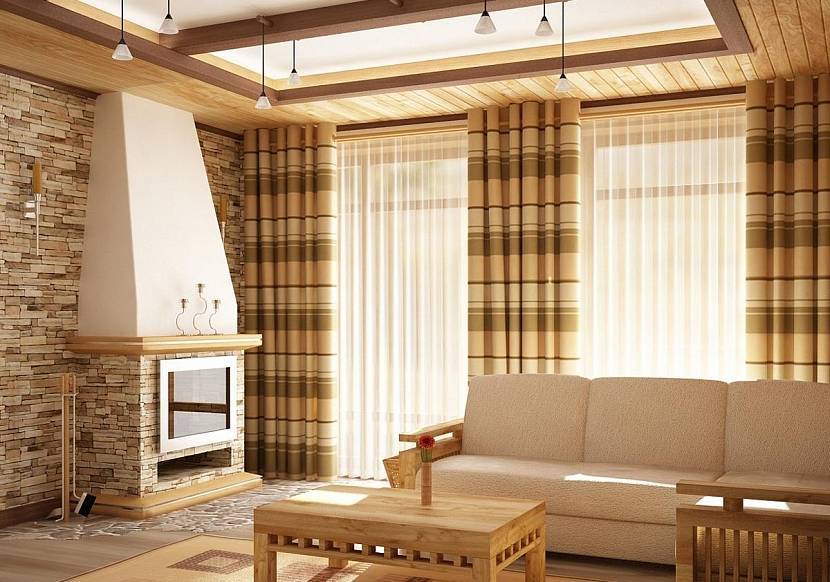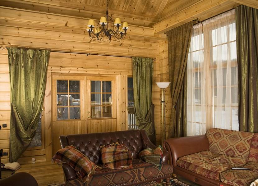Часто для обрамления окон и создания индивидуального дизайна в домах из бруса выбирают тюль и плотные шторы в деревенских мотивах. Также используют самые различные идеи такого обустройства.