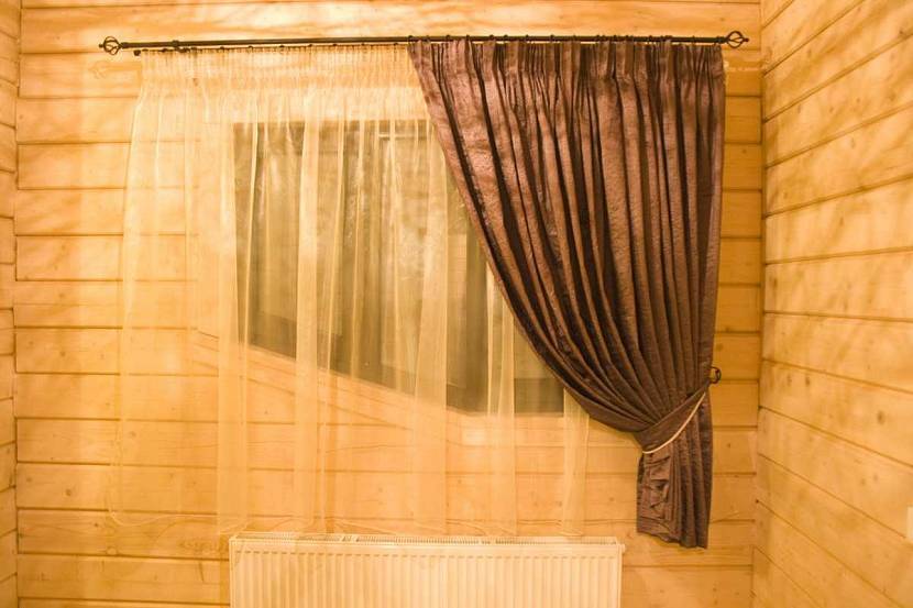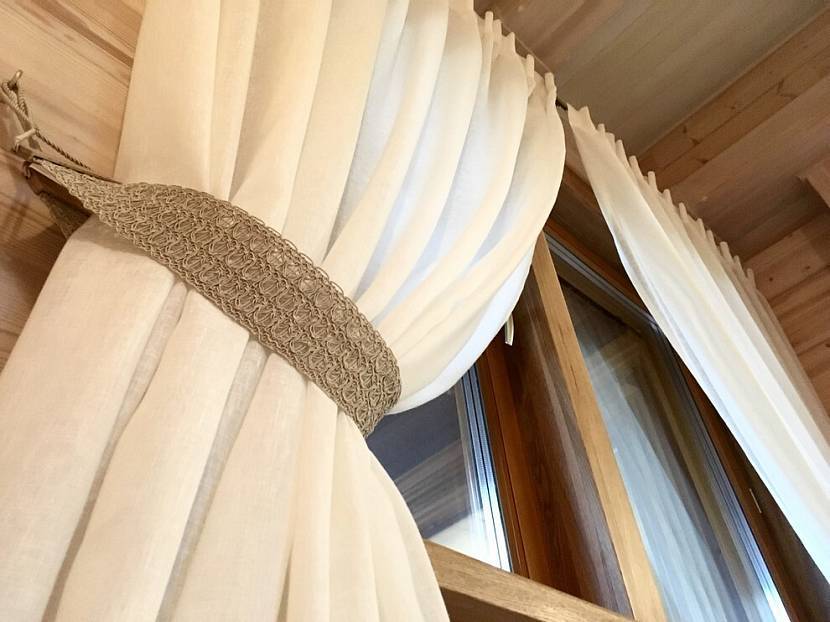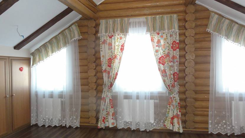 Деревенские шторы на скошенных окнах дома из бревенчатого бруса будут очень оригинальны. Только они требуют индивидуального способа крепления. Карнизы устанавливают под таким же углом, как проходит и верхняя часть оконной рамы. В таких случаях нужно отдельно заказывать шторы. Чтобы меньше виднелась нестандартная или старенькая гардина, прикрыть ее можно широкой накладкой из темной ткани.