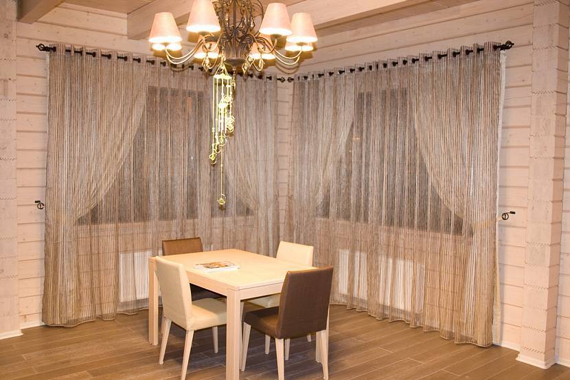 Полупрозрачные шторы с вертикальной полоской неплохо смотрятся на фоне стен из профильного бруса. Такие тюли держатся на градинах с круглым сечением с помощью широких люверсов.