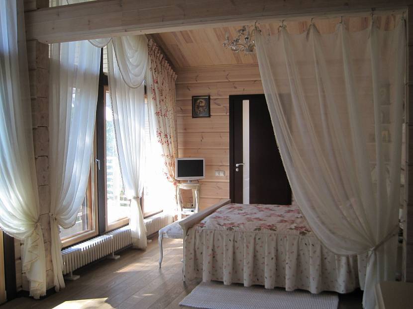 Добавляют комнате уюта, мягкости, защищенности. Изготавливаются из цельного полотна или из его фрагментов. Хорошо сочетается с другими прозрачными материалами, может использоваться и «сольно»