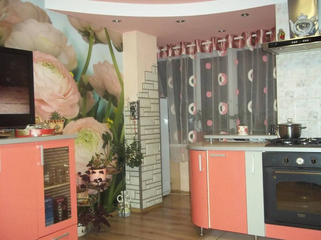 Длинные шторы на люверсах будут прекрасно смотреться на кухне — студии или просторной столовой. В этом случае можно выбрать яркие варианты с крупным рисунком.