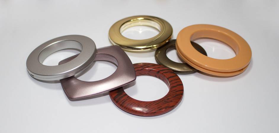 Наибольшее распространение получили пластмассовые крепления. Их отличает демократичная цена и широчайший выбор цветовых решений. Шторы на подобных крепежах не царапают карниз и не издают неприятного шума. Сами люверсы сохраняют свою целостность при контакте с влагой, потому их можно стирать вместе с основным полотном.