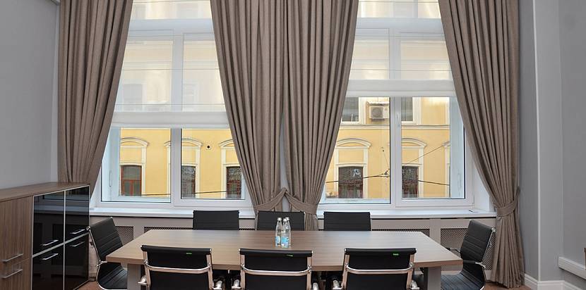 Бежевые гардины для окон в кабинете Источник kraslen.ru