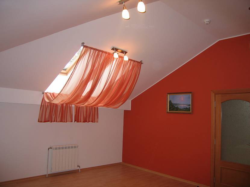 Мансарда представляет собой утепленную часть дома под кровлей. В этом заключается ее отличие от чердака, который не только не имеет отопления, но также не зарегламентирован как жилая часть жилища. Окна мансарды зачастую установлены наклонно, так как стенами в данном случае являются скаты кровли. Подбирая шторы к таким окнам, нужно учитывать, что при всем желании они не будут висеть параллельно стеклянному полотну, если не зафиксировать их определенным образом.