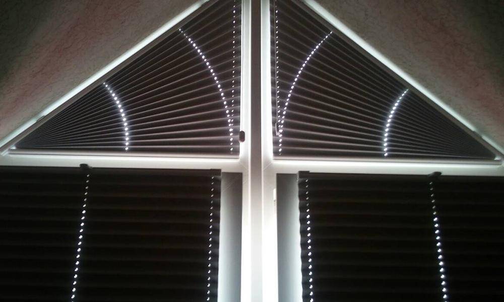 Шторы данного типа крепятся на 2 балки: верхнюю и нижнюю. Полотно образует между ними гармошку из ткани. Штанги для плиссе бывают любых размеров и форм, что удобно для нестандартных угловых окон.