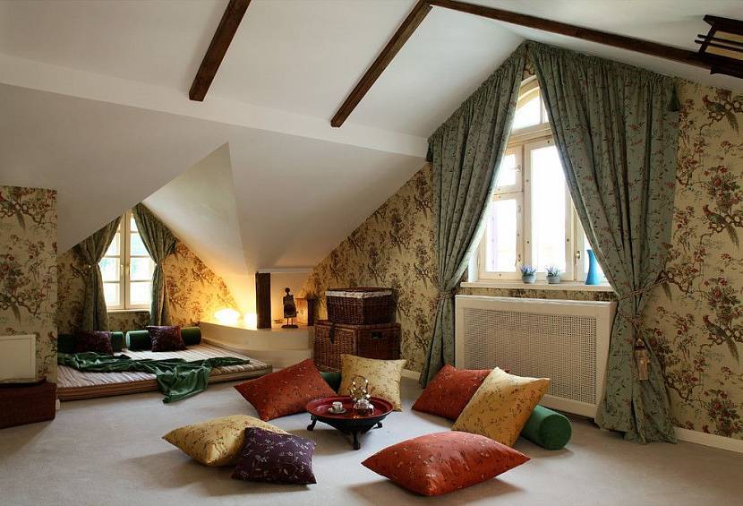 Рисунок на шторах хорошо смотрится, если мансарда обустроена под детскую.