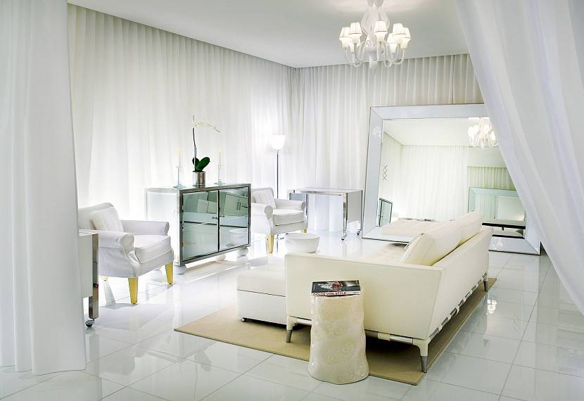- Монохромный белый цвет часто применяют дизайнерами для декорирования оконного проёма. Используют для этих целей полотна с интересной текстурой, гардины с красивым плетением ткани. Белые занавеси визуально расширяют пространство, заполняют комнату светом, ощущением «свежести».
