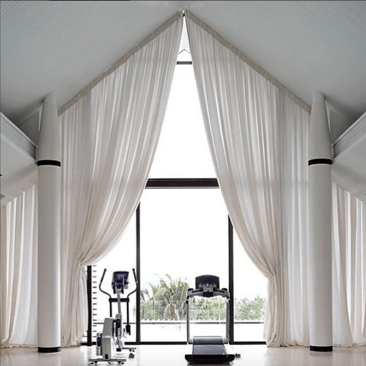 - Треугольные. Крупногабаритные конструкции устанавливаются на фронтоне. При оформлении чаще всего используются фиксированные портьеры, закрепленные на одном или двух наклонных карнизах, размещенных вдоль верхних сторон треугольника. Также можно использовать тюль, гардины с подхватами, установленные на зафиксированных подвесах.