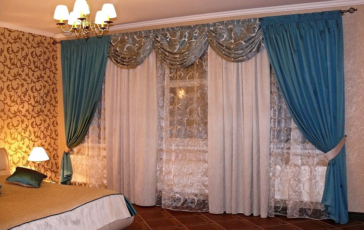 Для зала или гостиной шторы нужно подбирать с таким учётом, чтобы они показывали на богатство и грациозность частного дома. Совет: если в вашей гостиной расположены четыре окна в одну линию, то лучше и красивее будет завесить их одной гардиной и двумя портьерами по краям. Этот вариант всегда будет смотреться выигрышнее.