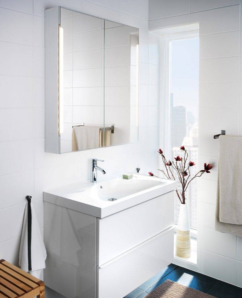 На фото ванной ИКЕА частенько можно увидеть окно, что является редкостью для наших домов. В отсутствии естественных источников света предлагается огромный выбор искусственного освещения разной направленности и интенсивности.