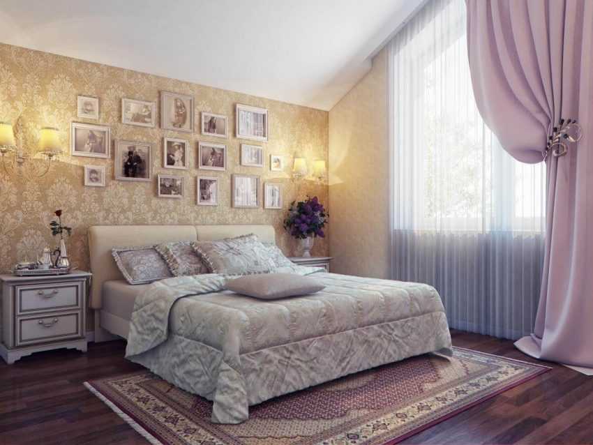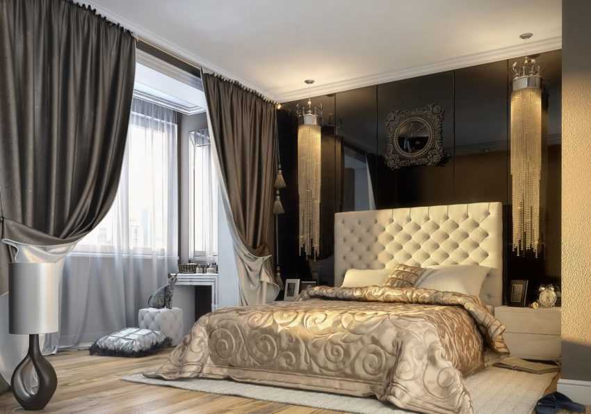 Традиционный для спальни вариант ― тяжелые раздвижные портьеры из плотного шелка с ламбрекеном из той же ткани и шелковый тюль. Их украшают бахромой, кистями и собирают по бокам прихватами или заколками.