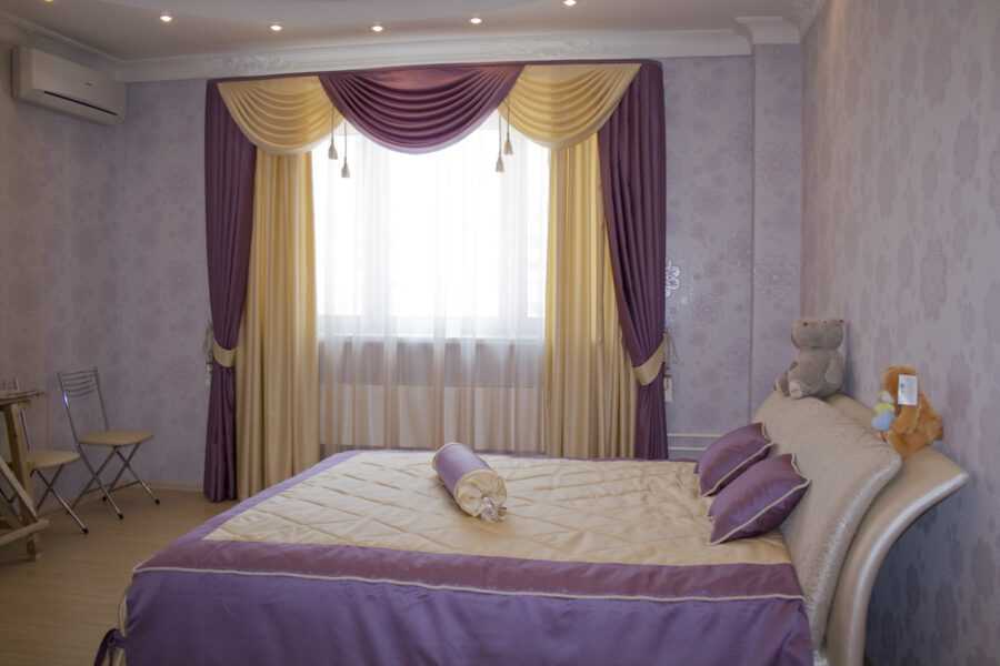 От стиля спальной комнаты зависит и выбор конструкции штор. Раздвижные портьеры более универсальны и подходят для всех стилей. Подъемные модели уместны в современных помещениях, хотя более декоративные варианты (например, французские) используются в дизайне классической спальни.