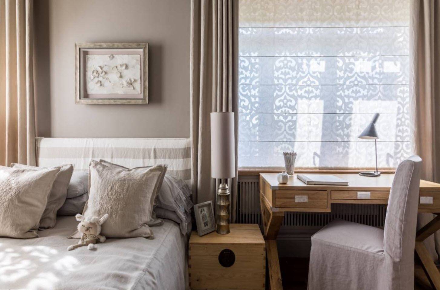 Окна, расположенные на западной и северной сторонах, постоянно находятся в затенении и им не помешают тёплые нотки. Здесь будут хорошо смотреться бежевые, песочные и светло-коричневые цвета.