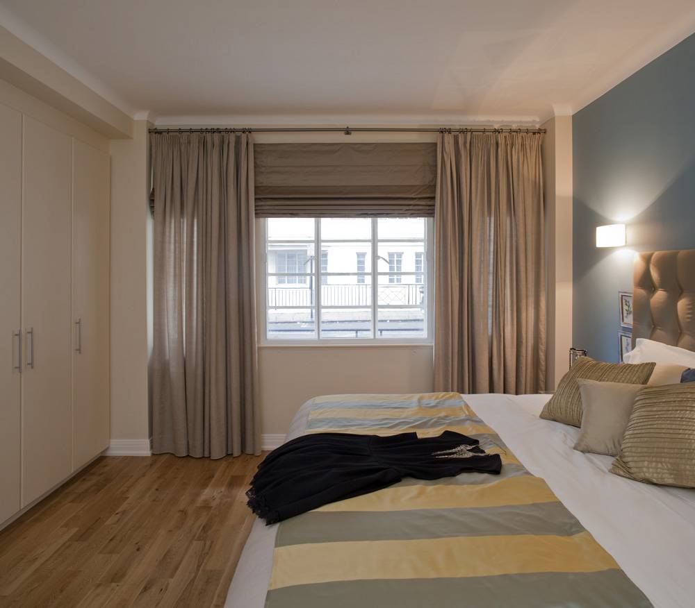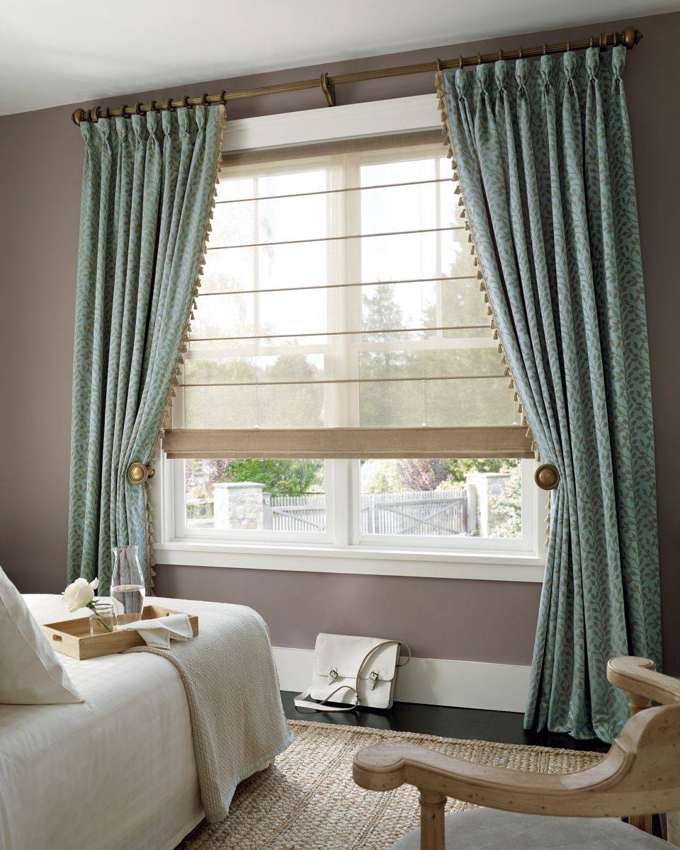 В удобстве, практичности, а также актуальности римских или рулонных штор сомневаться не приходится. Но в спальне хочется особенного уюта, мягкости и возможности оградиться от внешнего мира. Сохранить баланс поможет комбинация коротких и длинных штор.
