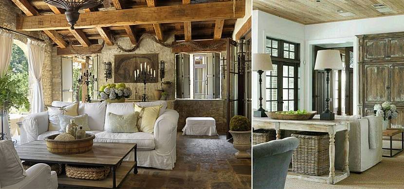 Если в провансе используются лавандовые, голубые и лиловые оттенки при окрашивании поверхностей, местами облупившиеся и слегка затертые, то в кантри стены и потолки не красят. Здесь применяется только морилка и лак для отделки грубых деревянных стен, полов и потолков.