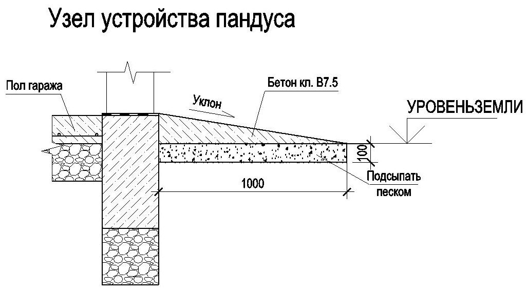 По всему периметру гаража на внешней стороне делается бетонная отмостка, чтобы дождевые воды не портили фундамент. Достаточная ширина отмостки – 500-700 мм. Изготавливается она из бетона В-7,5, уложенного на песчаную подушку. На фасаде с воротами оборудуется пандус – наклонная площадка для удобного въезда в гараж автомобилей, инвалидных и детских колясок. Ширина пандуса, в зависимости от общего рельефа, может составлять от 500 до 1200 мм.