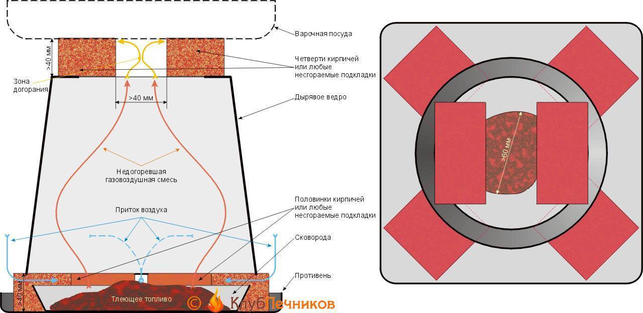 Простейшая варочная печь из прохудившегося ведра (см. рис. ниже) не однажды выручала автора в самых различных обстоятельствах, в т.ч. справлялась с обогревом по-черному бытовки без потолка под двускатной крышей – там под коньком было волоковое оконце. Противень служит улавливателем выпадающих угольев; если печка работает в помещении, под него нужно подложить огнестойкую подкладку, напр., еще несколько кирпичей. Выдирать из ведра днище полностью нет нужды – достаточно разворотить его так, чтобы дыра была прим. 6 см в поперечнике (шириной где-то в ладонь).