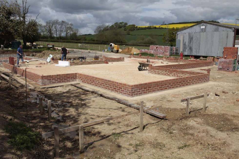 Площадка для будущего строительства расчищается под ленточный фундамент. Удаляется мусор, камни и растительность вместе с корнями. Если в зоне участка находится муравейник, зараженный грунт заменяется на глубину до 30 см. Структура грунта на дне котлована должна сохранять ровную геометрию. Если планируется укладка коммуникаций, то контуры траншеи заполняются плотным сыпучим материалом, который затем трамбуется и бетонируется. Далее определяется ширина стен. Построить засыпной дом можно с наружными и внутренними стенами толщиной 20-50 см. Конкретная величина определяется количеством этажей с перекрытиями. Соответственно, для одноэтажного дома рассчитывают стены толщиной 20-30 см, а для трехэтажного – порядка 50 см.
