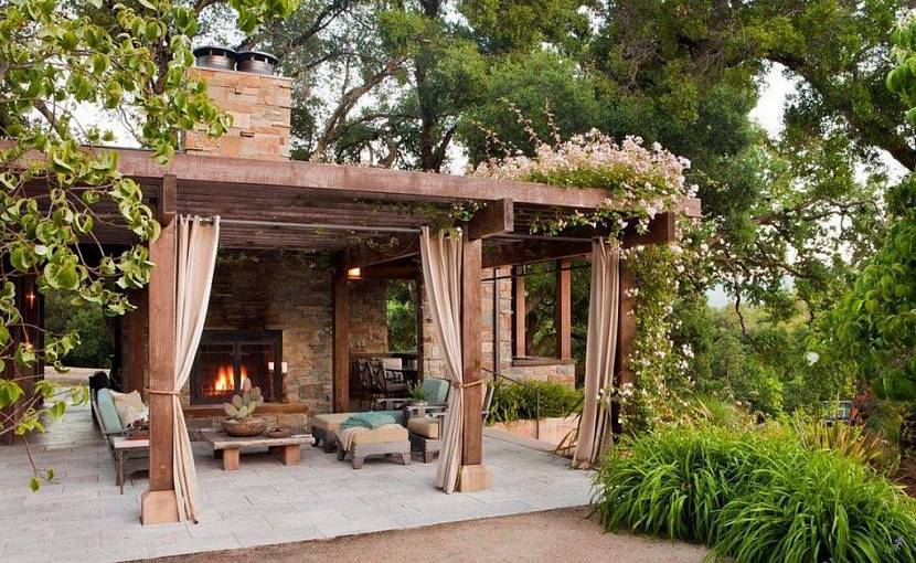 Пергольные беседки выглядят очень красиво, дают тень, но подходят только для сухих дней. К тому же ткань придется часто стирать, ведь темный цвет для них использовать не принято.