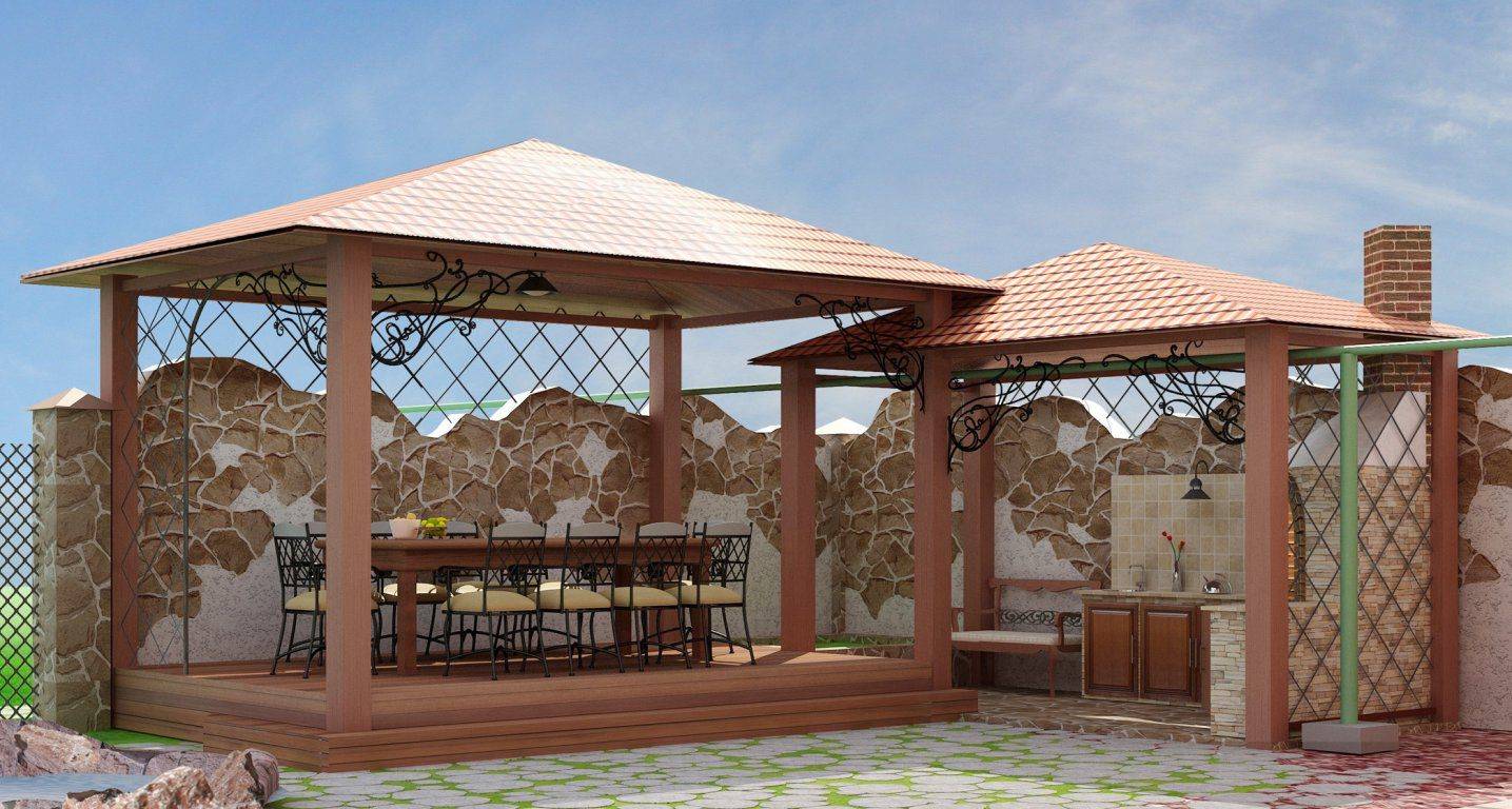 Возможен и вариант без текстиля: резные элементы или кованые решетки в качестве одной из стен постройки открытого типа.
