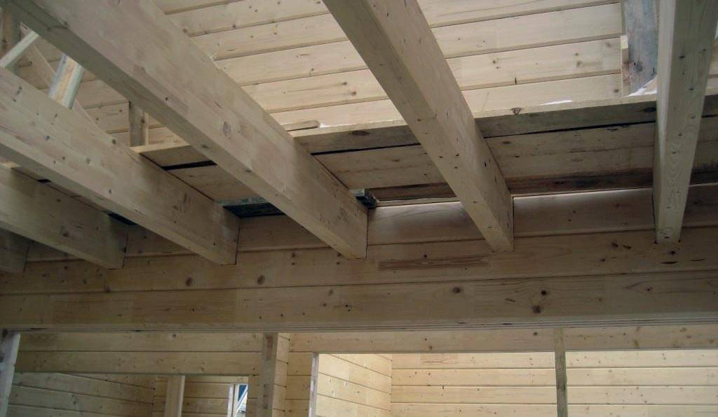 3. Установка перекрытий – устанавливаются балки из сосновой вагонки между этажами. Сверху потолка укладывается пароизоляционный слой и минеральная вата. После монтажа обрешетки и контробрешетки укладывается пол.