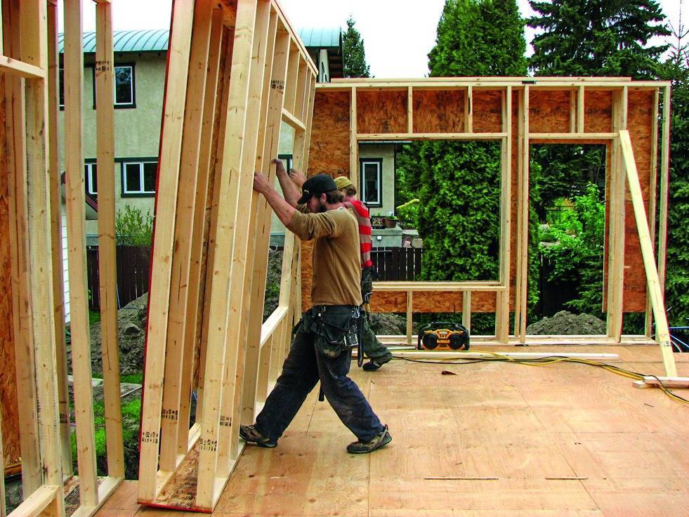 - методом «канадской платформы» — секции заготавливают горизонтально на черновом полу и выставляют их в проектное положение;