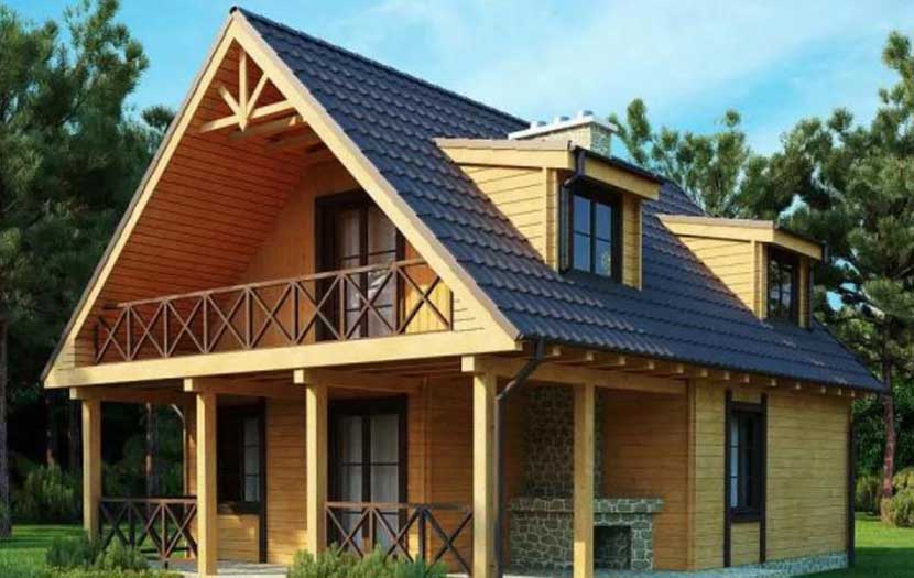 Конструктивно проста – технические характеристики и стропильная система как у обычной двускатной крыши. Прямые стропила опираются на мауэрлат, под углом сведены в конёк. Фронтоны треугольной формы, прямые, отвесные, практически всегда остеклённые, часто с выходом на балкон.