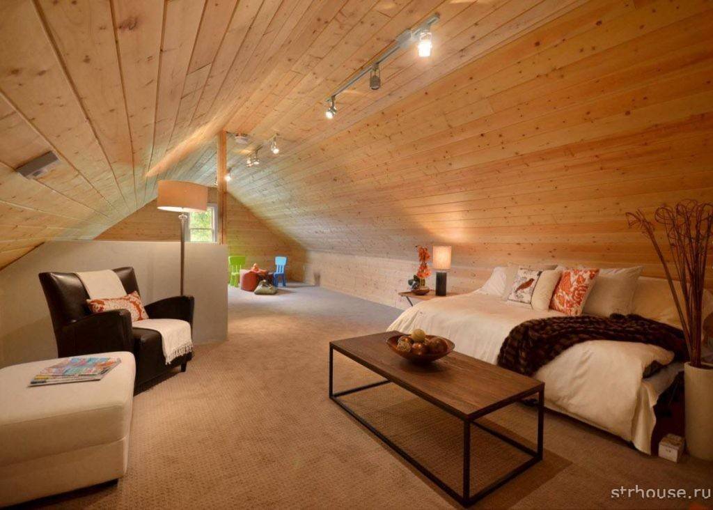 Интерьер мансарды с ломаной крышей: фото ниже.