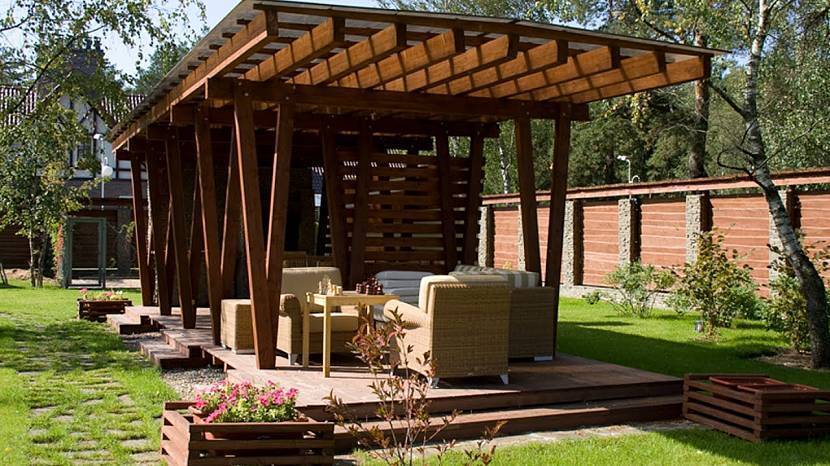 На маленьком дачном участке иногда используют простые открытые беседки. Парапет высотой 0,8 м ограждает периметр территории. Крышу монтируют на вертикальных опорах. Пол должен быть выложен выше уровня земли, что исключает затопление осадками и талыми водами. Простота беседки и легкость ее обустройства – не единственные достоинства; важную роль играет и пригодность для установки в любой точке сада.