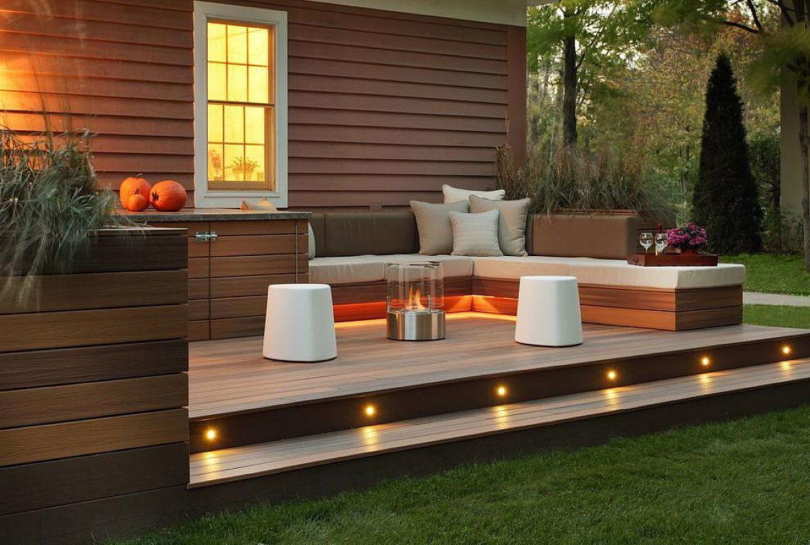 - освещение – важный элемент организации патио на даче, ведь посиделки часто заканчиваются уже после заката. Решить проблему искусственного света можно при помощи нескольких садовых фонарей, бра на стене, гирлянд и т.д. Особый шик – встроенная в пол подсветка, которая создаст невероятную атмосферу.