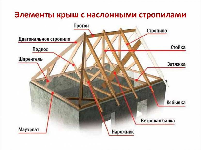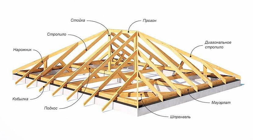 - Стропильной системы, элементов каркаса шатровой крыши, которые несут и распределяют ее вес на несущие стены и фундамент, предотвращая деформацию, проседание и обрушение.