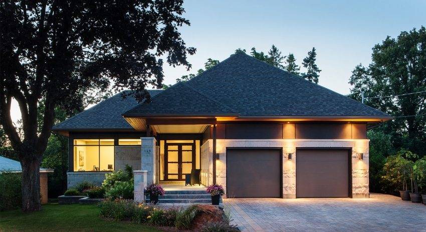 Отсутствие фронтонов делает высоту дома с вальмовой крышей визуально меньшей, однако в целом домостроение с такой кровлей выглядит органично. Фото одноэтажных домов с вальмовой крышей свидетельствуют о том, что зачастую пространство непосредственно под кровлей используется для обустройства уютного мансардного помещения. Для освещения мансарды в крыше располагают полноценные оконные конструкции.