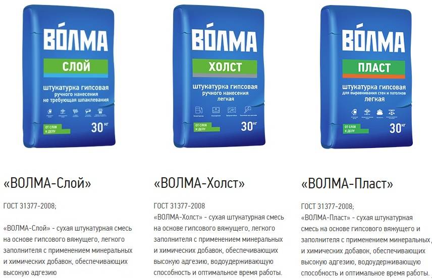Штукатурки «Волма» выполняются на цементной или гипсовой основе. Также для увеличения прочности, липучести и иных положительных свойств в состав материалов вводятся стабилизаторы, модификаторы, пластификаторы, морозостойкие добавки, антислеживатели и т. д.