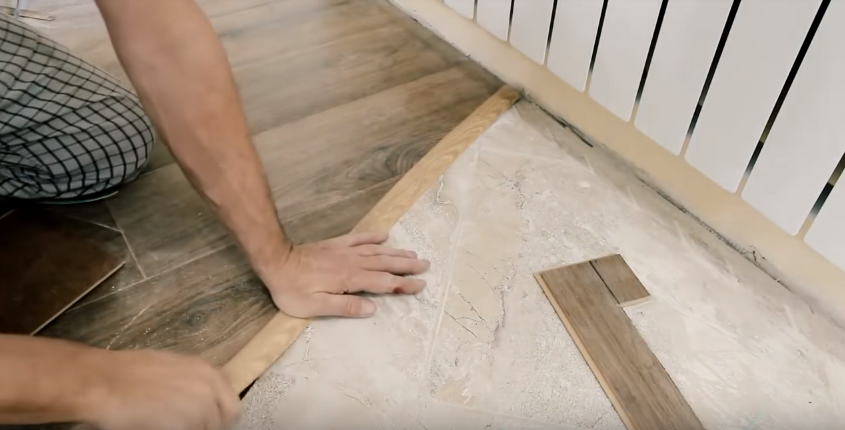 - Подогнать плитку и ламинат друг к другу на одном уровне. То есть оба напольных покрытия должны быть одной толщины. При этом между ними оставляется ровный зазор 5-6 миллиметров;