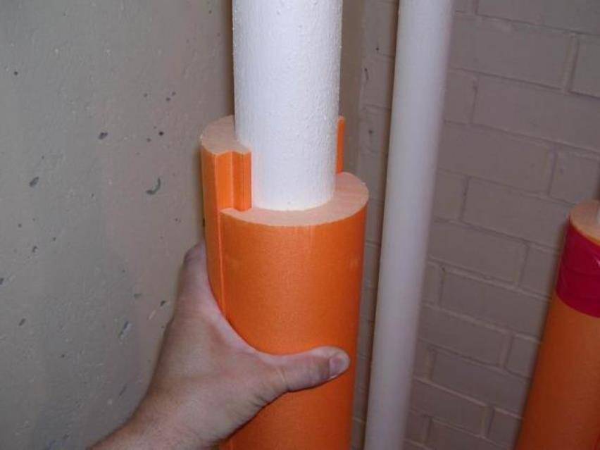Пенопластовые (или полиуретановые) детали полукруглого сечения надеваются вокруг канализационного стояка и соединяются с помощью специальных пазов. Затем изоляцию фиксируют строительным скотчем.