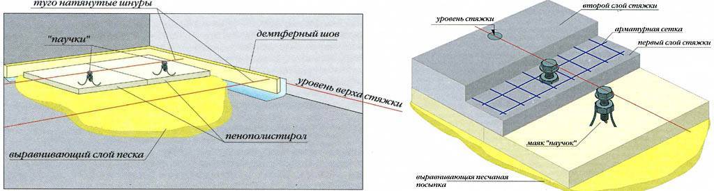 При заливке плавающей стяжки дилетантами обнаруживается, что обычные линейные маяки на слое изоляции не держатся. Для таких случаев разработаны т. наз. реперы или маяки-пауки, см. рис. ниже. Заливка стяжки по паукам производится пошагово: