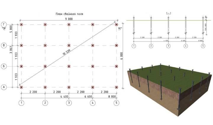 При закладке на каждое свайное поле должен быть разработан чертеж. Этот документ служит своеобразной инструкцией по проведению всего комплекса работ. Следование указанным расчетам гарантирует выход на проектируемые показатели всего строения