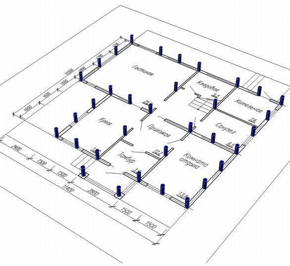 Допустим, что для каркасного дома получилось количество свай, равное 17. Это еще не итоговый результат. С помощью чертежа с контуром здания и стенами выполняют распределение опорных точек. Их устанавливают в местах сопряжения ограждающих конструкций, в углах. На прямых отрезках строительных конструкций устанавливают сваи с шагом не более 300 см.