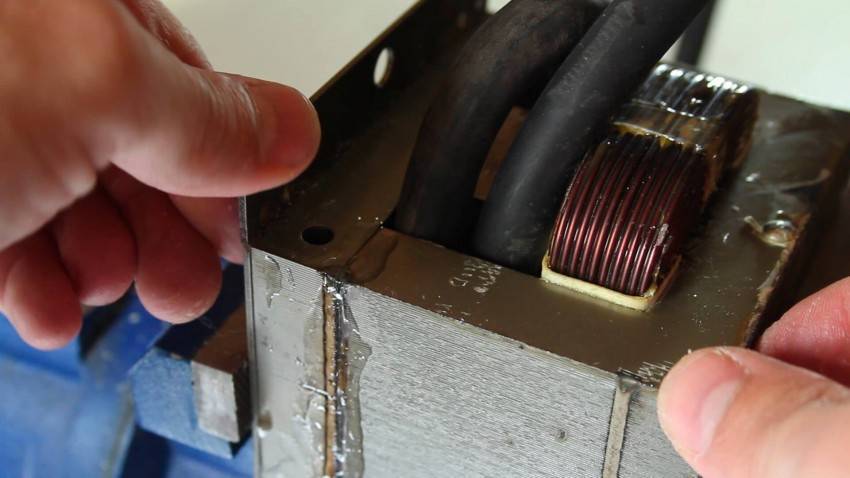 Чтобы самостоятельно изготовить точечный сварочный аппарат, потребуется один трансформатор от микроволновки мощностью 700-800 Вт. С него нужно убрать вторичную обмотку способом, описанным выше, в разделе, где рассматривалось изготовление сварочного аппарата из микроволновки.