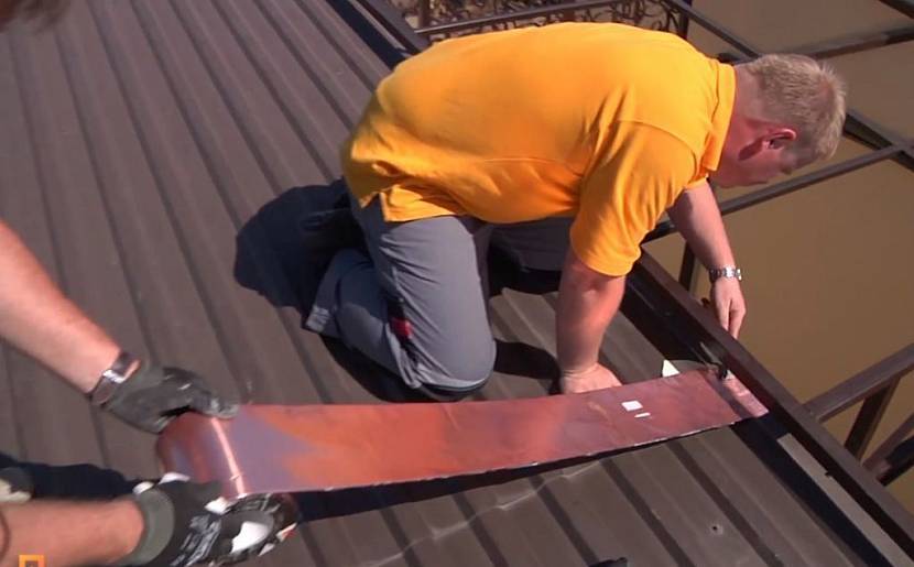 На нижней части полотна в нескольких местах ножницами делают надрезы для распределения по плоскости крыши. Затем с отрезанного куска полотна снимают предохранительный материал. Готовый для использования скотч прикладывают на требуемый участок, прорезанную область приклеивают к поверхности кровли