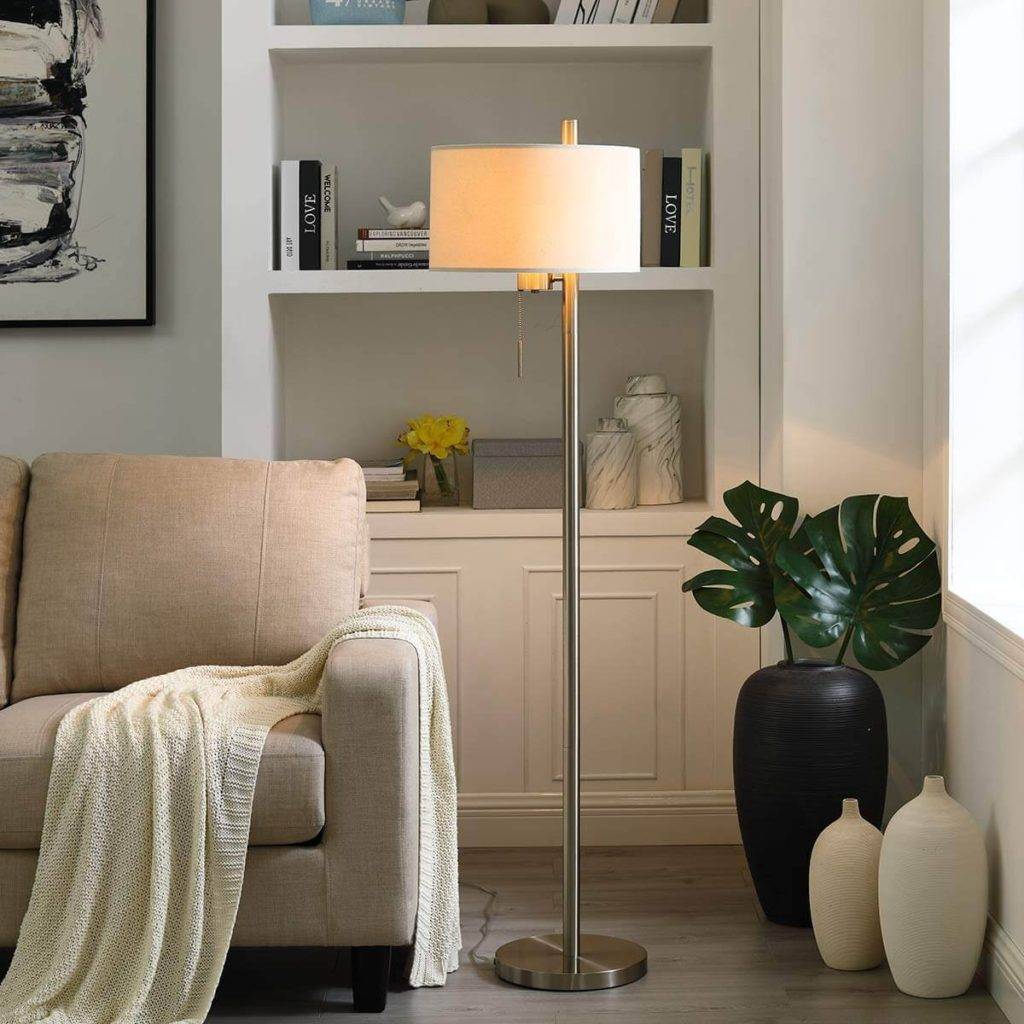 Шикарный напольный светильник выше на фото, это изумительное приспособление не с одним, а тремя привесными светильниками, привносящими тонны рассеянного света в вашу гостиную. Подвески перекликаются с современными и винтажными светильниками середины века со знакомой формой барабана. Вы можете легко поместить этот великолепный светильник в любой декор гостиной, в том числе современный, эклектичный, традиционный.