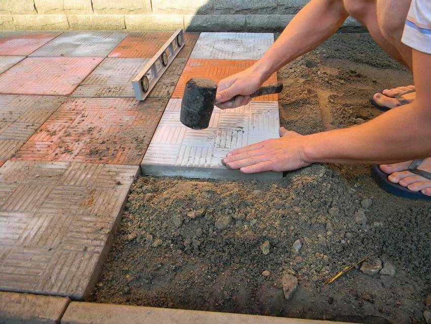 “Посадка” тротуарной плиткиПлитка укладывается в предназначенное для нее место и устанавливается точно путем легкого постукивания по ней резиновым молотком. Если плитка проваливается под нее подсыпается песок или смесь.