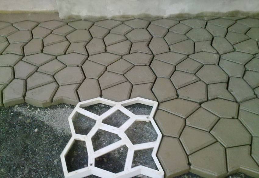 Технология заливки в форму-опалубку — самый простой и наименее трудоёмкий способ изготовления тротуарной плитки. Изделия отливаются прямо на месте использования поверх утрамбованного грунта, поэтому никаких усилий на сушку и перемещение плит тратить не приходится. Поскольку форма снимается пока бетон застыл не полностью, можно пользоваться только одной формой и готовить небольшие порции раствора в ведре строительным миксером (без бетономешалки). Форму также можно заливать не полностью, формируя аккуратные изгибы садовой дорожки.