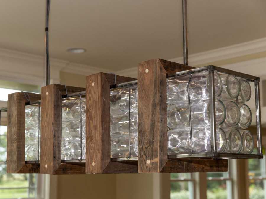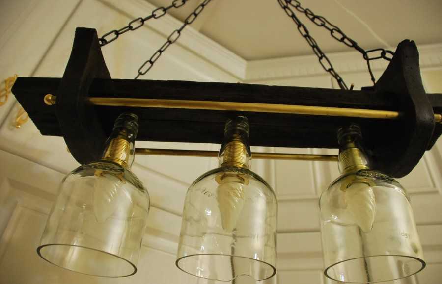 На кухню больше подойдут люстры из бутылок, сделанные своими руками. Конструкции из стекла или пластика будет легко очищать от пыли и при необходимости мыть. Для кухни, прихожей или гостиной подойдет светильник из натурального дерева.