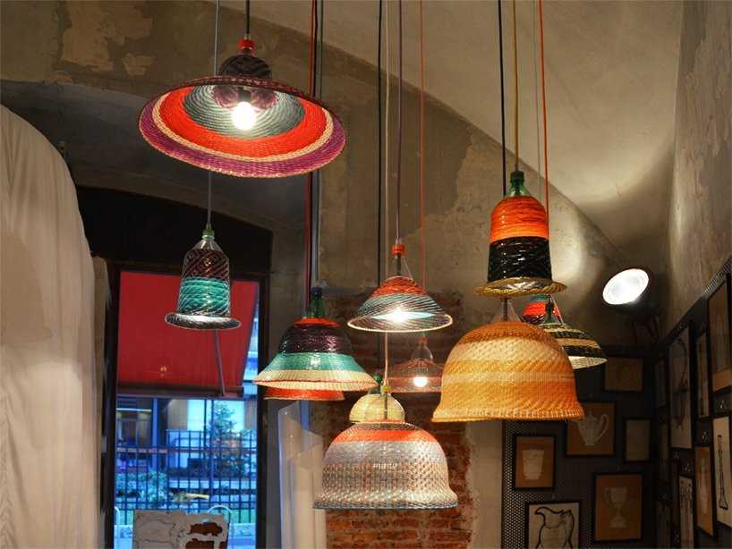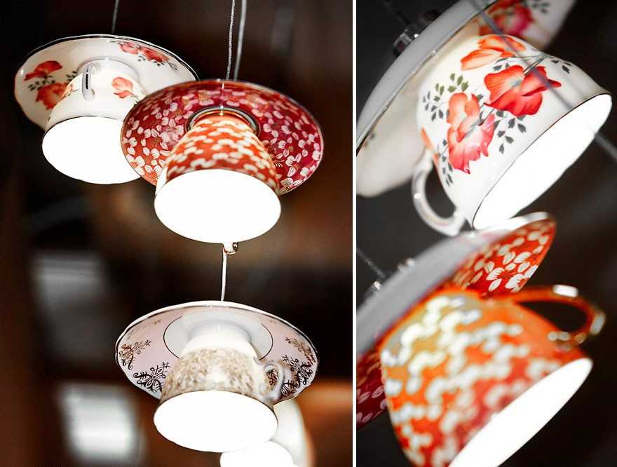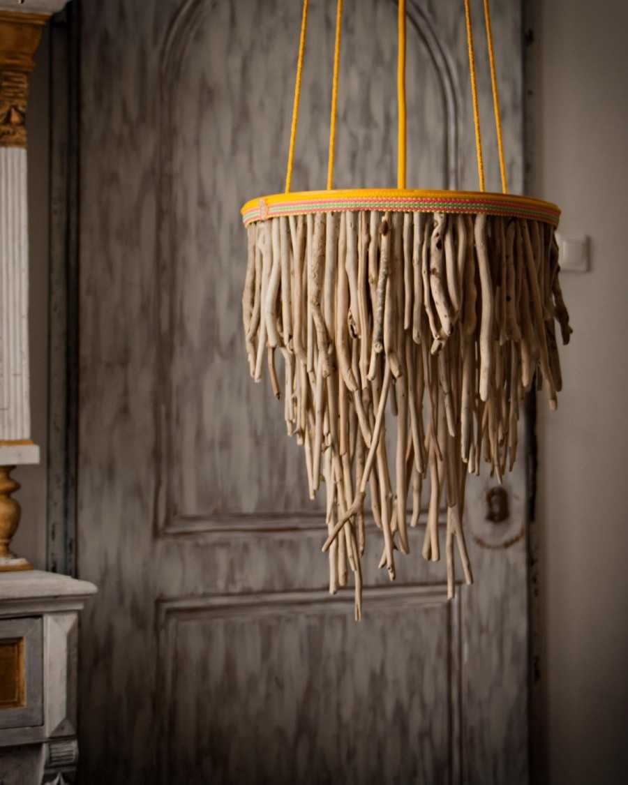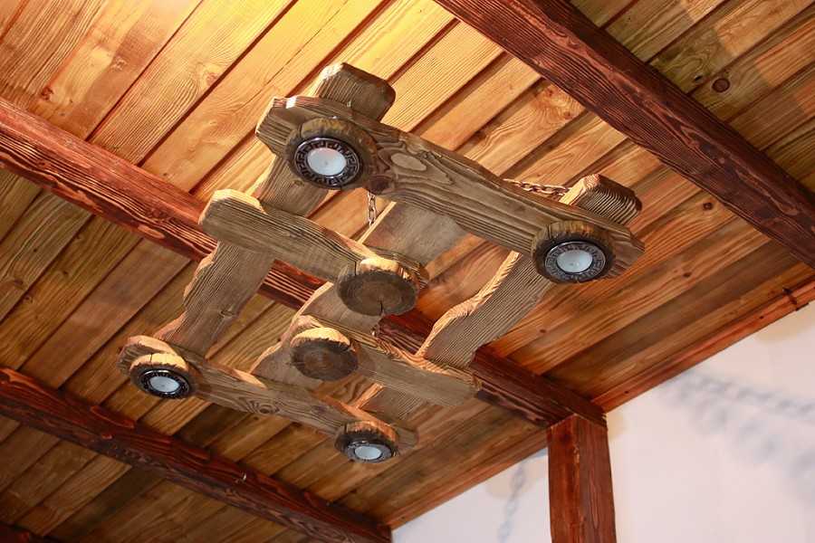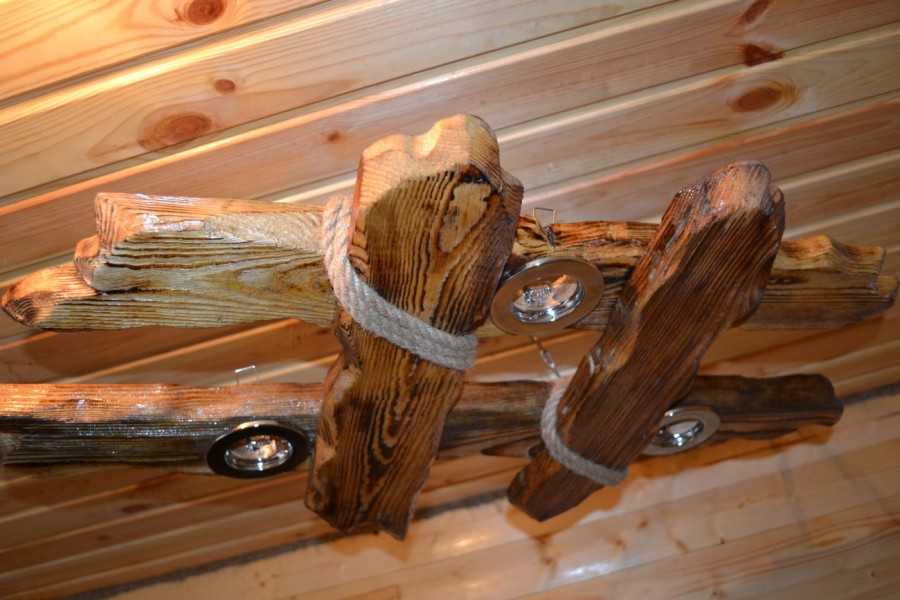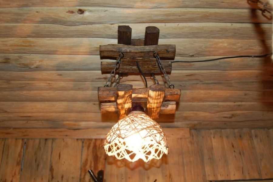 Распространены потолочные светильники из пряжи, которой обматывают воздушные шарики, а потом всю конструкцию покрывают клеем. Для многих такой простой вариант – первая проба в этом виде рукоделия. Эффектнее смотрятся люстры из коряги, бутылок или подвесные конструкции из пластиковых труб.
